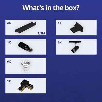 Descrizione Bright Choice Set completo 1-Fase Rail L 1,5 x 1,5 Metro Nero | incl. 6x Faretti + GU10 2700K 3W Dimmerabile + Tappo Di Chiusura, Connettore di Alimentazione e L -Connettore