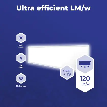 Questo pannello LED di Noxion ha dimensione 120x30cm, che lo rende perfetto da montare in un soffitto a griglia, ma può anche essere montato a superficie con degli accessori appositi. Inoltre consuma solo 28 W ma ha una potenza luminosa di 3360 lm, il che lo rende un perfetto sostituto dei tubi fluorescenti 2x36 W. I costi energetici saranno fino al 70% più bassi rispetto a un apparecchio convenzionale.
