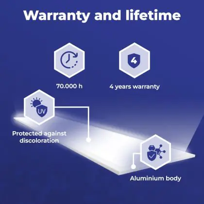 Questo pannello LED ha un ciclo di vita di 70000 ore, che vuol dire che funzionerà in modo ottimale per diversi anni. Questo ti permetterà di risparmiare sui costi di manutenzione e sostituzione! Inoltre, questo pannello LED è protetto da una garanzia di 4 anni. Infine, l'illuminazione LED permette di ridurre le emissioni di CO2 e, non contenendo sostanze tossiche, i LED possono essere riciclati.