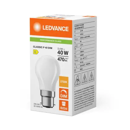 La Ledvance Classic LED B22 Pera Ghiaccio 3.4W 470lm - 827 Bianco Molto Caldo | Dimmerabile - Sostitutiva 40W è la sostituzione perfetta per la tua lampada convenzionale 40W B22. Sostituire con il LED ti offrirà molti vantaggi.