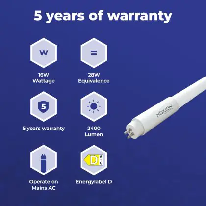 Il Noxion Avant LEDtube T5 Avant Extreme (Mains AC) High Efficiency 16W 2400lm - 840 Bianco Freddo | 115cm - Sostitutiva 28W è un tubo LED perfetto per sostituire gli standard tubi fluorescenti di 28 W. Con questo tubo LED di Noxion ti assicuri una lunga durata e 5 anni di garanzia.