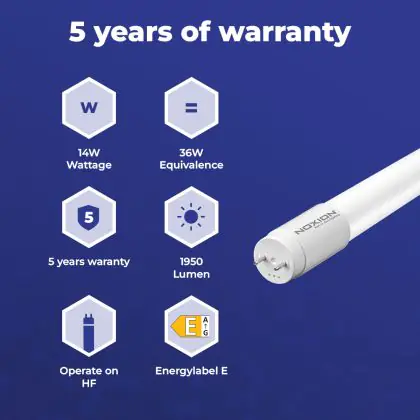 Il Noxion Tubo LED T8 Avant Extreme (HF) High Output 14W 1950lm - 830 Luce Calda | 120cm - Sostitutiva 36W è l’alternativa perfetta per il tubo fluorescente standard 36W nelle plafoniere con un reattore. Con questo tubo LED hai una garanzia di una vita media utile molto lunga e 5 anni Lampadadiretta.it di totale garanzia. .