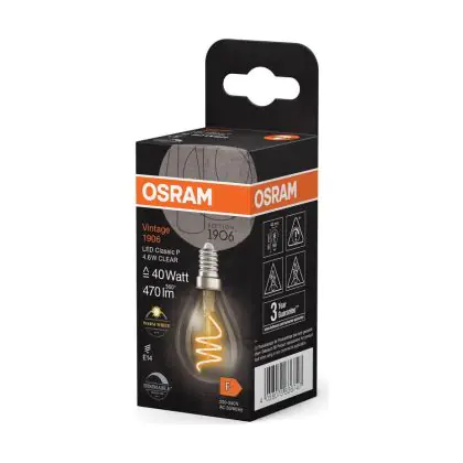 La lampada Osram Vintage 1906 LED Classic Slim E14 Pera Filamento Chiara 4.6W 470lm - 927 Bianco Molto Caldo | Miglior Resa Cromatica - Dimmerabile - Sostitutiva 40W è il sostituto perfetto per le tue vecchie lampade 40W con attacco a vite piccolo E14 grazie alla sua tecnologia LED. Passare a LED ti offrirà molti vantaggi!