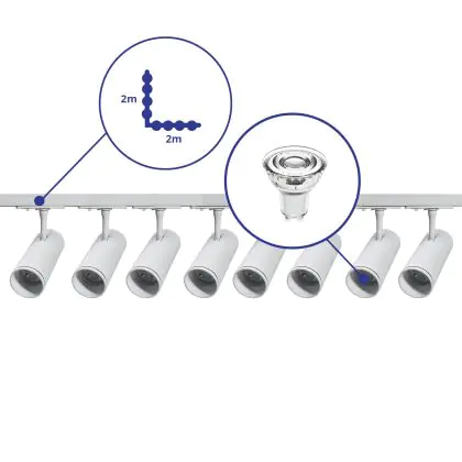 Descrizione Set completo 1-Fase Rail L 2 x 2 Metro Bianca | incl. 8x Faretti + GU10 2700K 3W Dimmerabile + Tappo Di Chiusura, Connettore di Alimentazione e L -Connettore